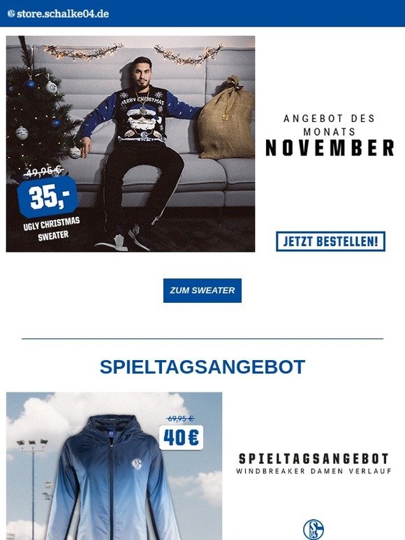 Other ugly Christmas sweaters will be cow-ering in the corner shying away from the beefiness that is this winter woolly. Holt euch das Angebot des Monats im Schalke 04 Store. Dein neuer Weihnachtspullover endlich erhltlich.